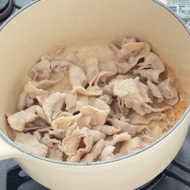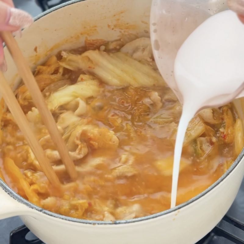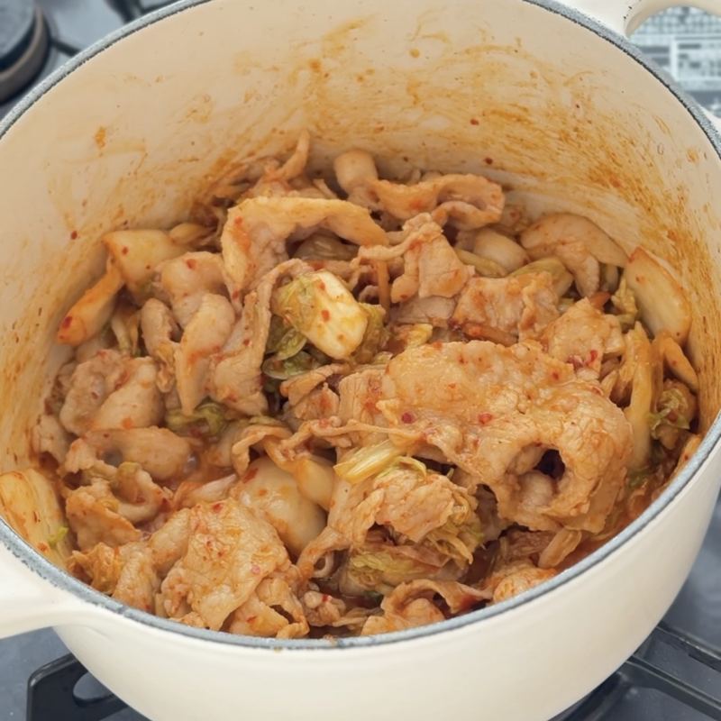 ①鍋にごま油を敷き、豚バラ、キムチの順に炒める。