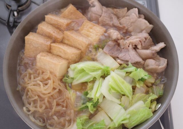 ①鍋にもやし、ひき肉の順に入れ、