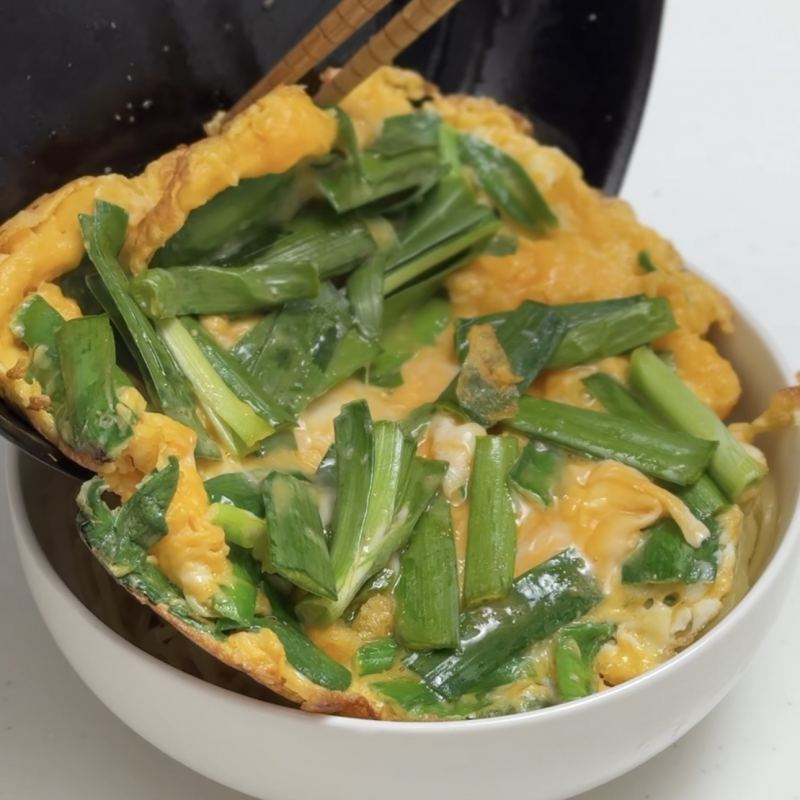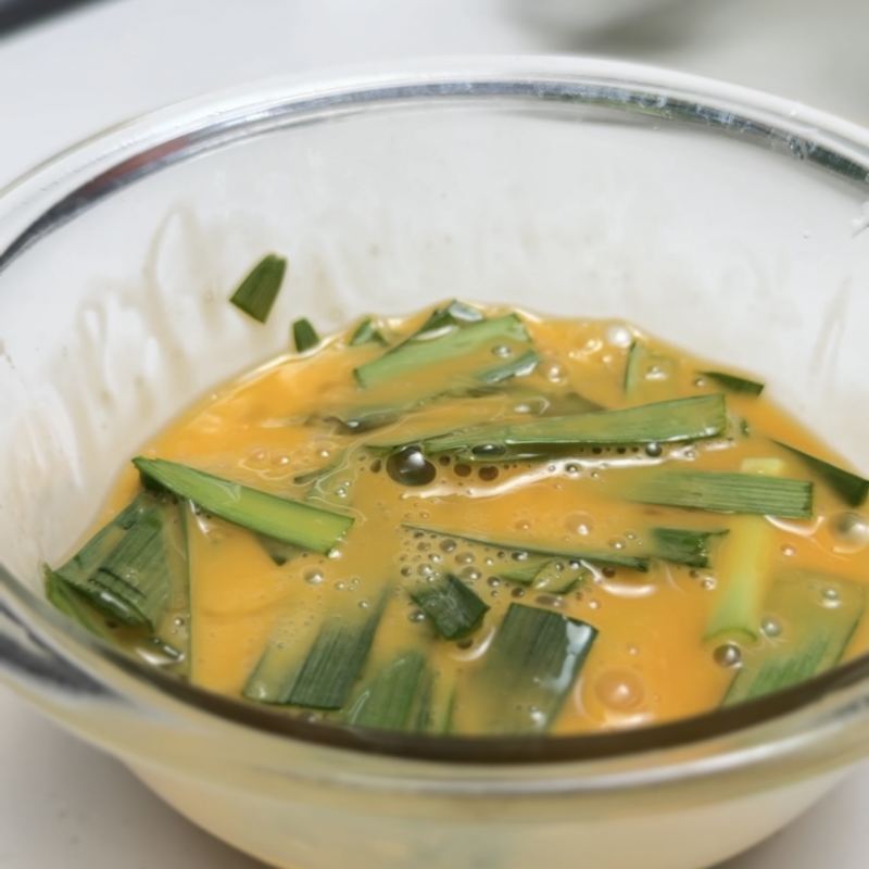 ①卵はとき、ニラを切り入れておく。